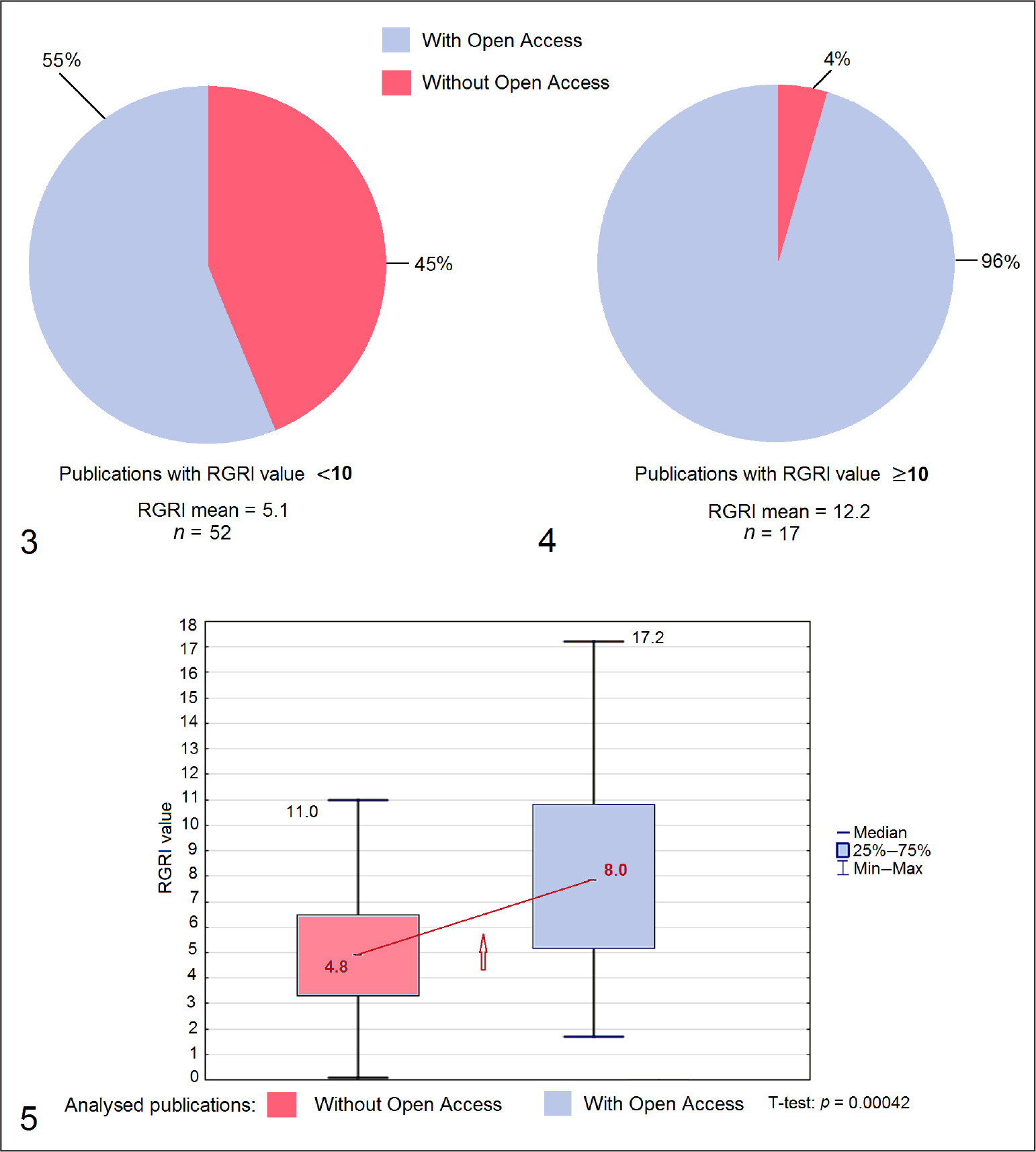 Figs. 3–5. RGRI value and the share of analyzed publications published in journals with open access or without it. 3 – publications with RGRI value less than 10 scores; 4 – publications with RGRI value 10 scores or more; 5 – difference in RGRI median between publications published in journals with open access (OA) and without OA