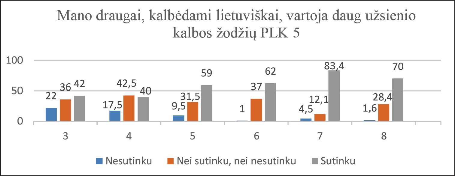 Kaip matyti iš 8 diagramos, didžiausia dalis mokinių, pritariančių teiginiui, kad reikia kurti daugiau naujų lietuviškų žodžių, yra pradinių klasių respondentai. Kuo vyresni mokiniai, tuo mažesnė jų dalis sutinka su šiuo teiginiu. Mažiausia dalis respondentų, pritariančių šiam teiginiui, – besimokantys aštuntoje klasėje. Apie pusė mokinių (išskyrus trečios ir septintos klasių) yra indiferentiški šiuo klausimu. Galima daryti prielaidą, kad mokinių sąmoningam požiūriui į lietuvių kalbos galių stiprinimą įtakos turi lietuvių kalbos mokymosi praktika: dėl prastėjančio mokinių raštingumo vis labiau susitelkiant į taisyklingos kalbos ugdymą, per mažai dėmesio skiriama pasitikėjimo savo, kaip etnolingvistinės bendruomenės narių, kalbos kūrybinėmis galiomis, sąmoningų nuostatų dėl kalbos išteklių gausinimo formavimui. Pažymėtina, kad požiūriui į lietuvių kalbos galių stiprinimą didelę įtaką turi mokinių literatūrinė (kultūrinė) patirtis. Tokią išvadą patvirtina mokinių požiūrio į teiginius: Manau, kad reikėtų kurti daugiau naujų lietuvių kalbos žodžių (PLK 3) ir Mėgstu skaityti knygas (PLK 6) reikšmingai teigiama koreliacija (Pirsono kriterijaus reikšmė, 153**).
