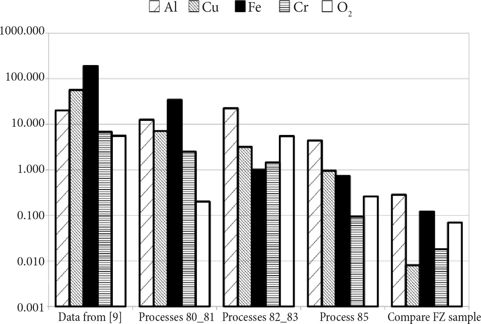 Based on the average values of the content of impurities for 3 samples in each process, histograms of changes in the concentrations of all impurities, with a concentration of more than 1 ppba, are shown in Fig. 3. The results of the control of undoped monocrystalline FZ silicon, designated as NHR, cut from a sample of serial production with a specific electrical resistance of more than 3000 Ω·cm of N type of electrical conductivity are also shown here. The presence of metallic impurities in this sample can be taken as the level of error in control measurements, since verification of the same sample for aluminum content by LT FTIR spectroscopy showed that the aluminum concentration in it was below the detection limit (ppta units). The oxygen concentration in the samples from the process discribed in [9] is shown in Fig. 1 and processes 80–83 and 85 determined by FTIR at room temperature are shown in Fig. 3. The comparison between the impurity concentrations in Figs 1 and 3 showed that the introduction of GDW lead to a decrease in the concentration of oxygen, copper, iron, cromium and aluminium. Concentrations of these impurities decreased significantly: iron from 190 to 34 ppba, copper from 60 to 8 ppba, cromium from 7 to 2.5 ppba and aluminium from 20 to 12 ppba, and the oxygen content in silicon decreased from 5 to 0.2 ppma. The concentration of all impurities, except for aluminium and oxygen, decreased when the ‘traps’ were turned on. The concentration of iron and chromium decreased to a level commensurate with the NHR sample, and copper fell to 3.5 ppba. The concentration of impurities of alkali metals Na and Ca and concentrations of antimony are not exceeding 1 ppba, in comparison with the results of the growing process described in [9].