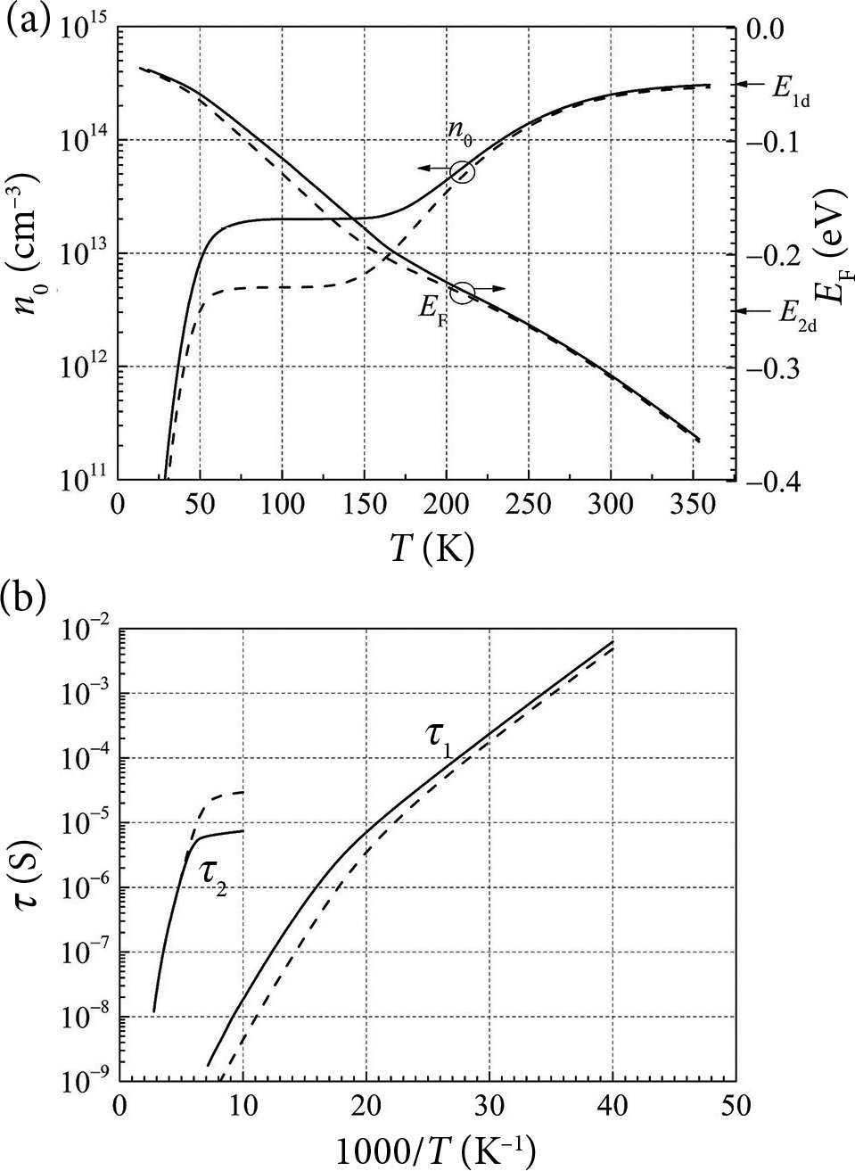 Fig. 12. (a) Temperature dependences of the free electron density (left scale) and the Fermi energy (right scale), and (b) dependences of the relaxation times of free electrons from the donor levels on reciprocal temperature (1000/T) in the partially compensated by acceptors na = 1.5·1013 cm–3 (dashed lines) and without the compensation by acceptors (solid lines) silicon sample with the shallow donor density n1d = 2·1013 cm–3 at the energy level E1d = 0.05 eV, and with the deep donor density n2d = 3·1014 cm−3 at the energy level E2d = 0.25 eV.