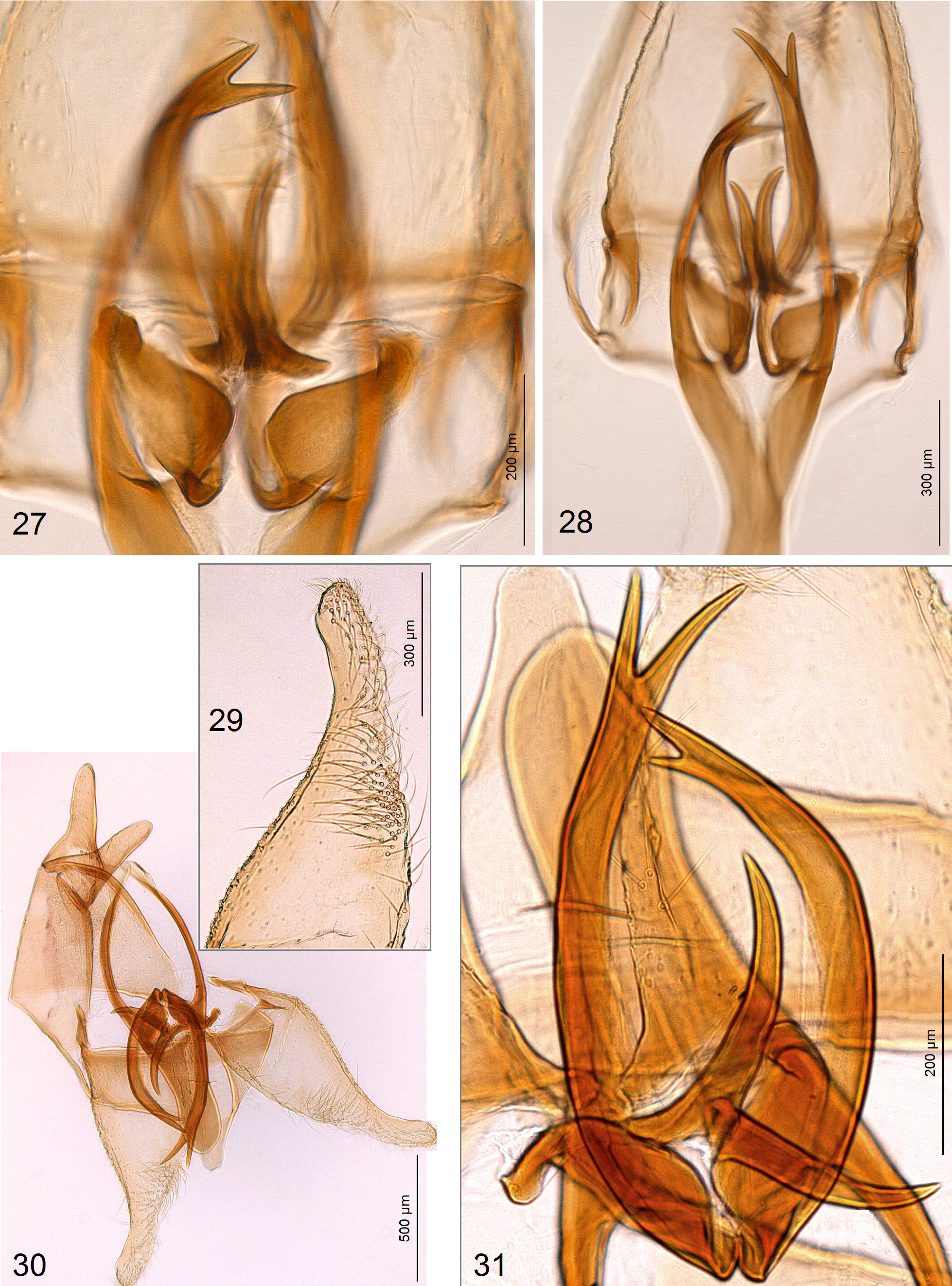 Male genitalia (Figs. 15–31). Capsule significantly longer (1395–1570 μm) than wide (755–780 μm). Uncus (Fig. 16) with two large lateral lobes. Socii membranous (Fig. 17). Valva (Figs. 18, 29, 30) 940–1035 μm long, narrowing distally; transtilla absent. Juxta (Figs. 15, 18, 21–25, 27, 28, 31) comprised of two shorter (260–360 μm) and two very long (980–1070 μm) horn-like processes (Fig. 6); the latter bifurcated distally and bent basally (see Figs. 21–25). Vinculum with a triangularly-shaped, slender ventral plate (Figs. 15, 16). Phallus (Figs. 19, 20, 26) 1190–1215 μm long, basally 80–150 μm wide, but broadly bifurcated in apical half (Fig. 20), with weakly chitinized plates on the top of each branch (Fig. 19).