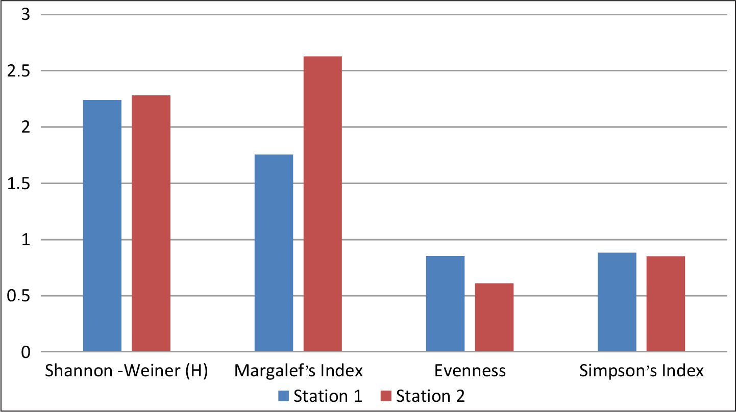A total of 282 macrobenthos individuals belonging to three phyla (Mollusca, Arthropoda, and Annelida), four classes (Gastropoda, Bivalvia, Insecta, and Clitellata), 11 genera, and 11 species were encountered. Mollusca had the highest number of taxa (7) and were the most abundant (gastropods 67%; bivalves 4%); they were followed by arthropods (3% and 28%, respectively) and annelids (1% and 1%, respectively), the least abundant during the sampling period. Biomphalaria pfeifferi was the most abundant species accounting for 32.6% of the total population of organisms during the sampling period, followed by Melanoides tuberculate (26.2%), Chironomus larvae (24.5%), and the least abundant Lymnaea natalensis and Lumbricus terrestris, each accounting for <1% of the total number of individuals (Fig. 4). Pollution indicator species, including Melanoides tuberculata, Biomphalaria pfeifferi, and Chironomus larvae, observed in the four sampling stations were the dominant species (Fig. 4). The highest number of individuals (individuals /0.6 m2) occurred in station 3 (97, nonvegetated) followed by station 1 (95, vegetated), then station 2 (48, vegetated), and the lowest in station 4 (41, nonvegetated). More molluscs were encountered in the nonvegetated sampling stations (Gastropods 11.11 ± 4.483; Bivalves 4.00 ± 3.00) than in vegetated stations (Gastropods 8.90 ± 3.548; Bivalves 2.00). Conversely, insects were higher in the vegetated (12.50 ± 6.513) than the nonvegetated area (5.000 ± 2.082). There was no significant difference (p < 0.05) in macrobenthos abundance between the vegetated and nonvegetated stations (Table 1). Shannon-Weiner (H’), Margalef’s and Simpson’s indices were higher in stations 2 and 4 than the other stations (Fig. 5).