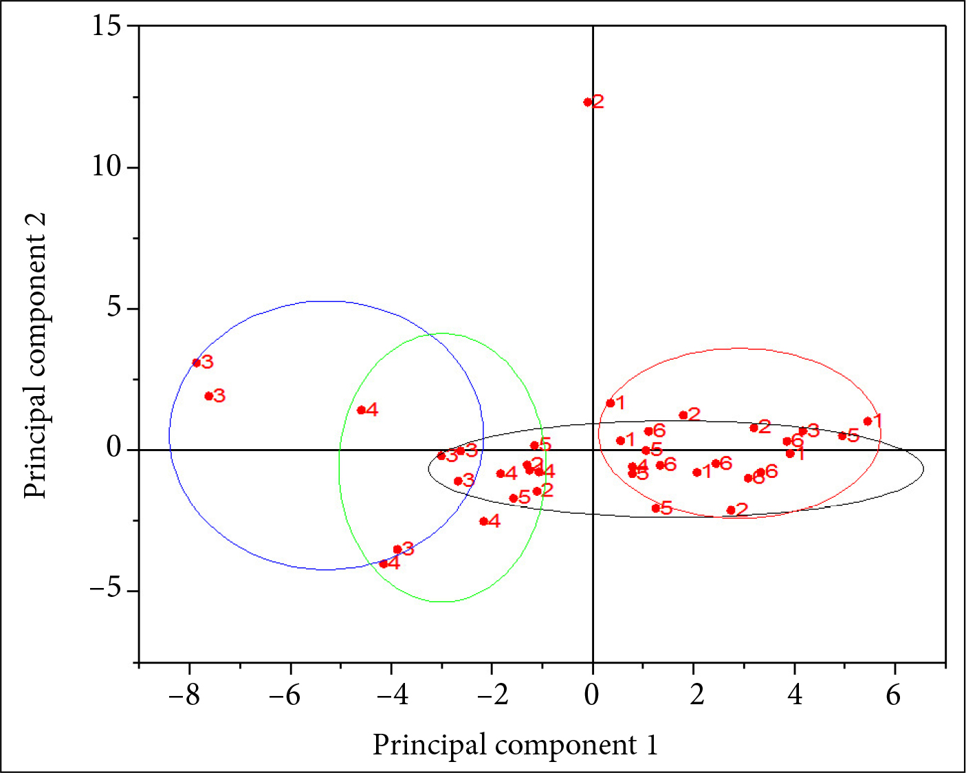 Fig. 5. PCA analysis. Clusters: red: Locations 1, 2 and 6; blue: Location 3; green: Location 4; black: Location 5