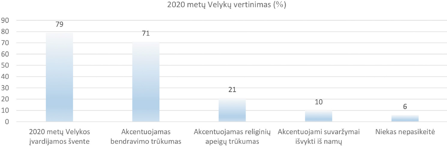 Dauguma respondentų pripažino, kad 2020 metų Velykos jiems buvo šventė, tik ne tokia kaip anksčiau. Daugiau kaip du trečdaliai žinių pateikėjų pasigedo gyvo bendravimo su šeima, artimaisiais ir draugais, o religinių apeigų nebuvimą minėjo tik penktadalis. Penkiolikmetės dzūkaitės žodžiai, kad 2020 metų Velykose trūko krienų, kurie auga jos senelės darže, padeda įvardyti viso tyrimo rezultatus: išryškėjo kulinarinės tradicijos ir bendruomeninės šventės svarba. Nors vyksta intensyvus sekuliarizacijos procesas, vis dar išlieka noras palaikyti, o prireikus atgaivinti ar sukurti šeimos tradicijas, kartu išlieka ir bendruomeniškumo svarba šiuolaikinėje visuomenėje. Virtualus bendravimas šventės metu daugeliui žmonių negalėjo atstoti gyvo bendravimo. Kita vertus, net ir įprastoje kasdienėje aplinkoje, tarp kasdien matomų žmonių, švęsdami trumpiau negu įprastai, didesnė dalis žmonių sugebėjo išeiti iš kasdienybės rutinos ir susikurti šventinę nuotaiką.