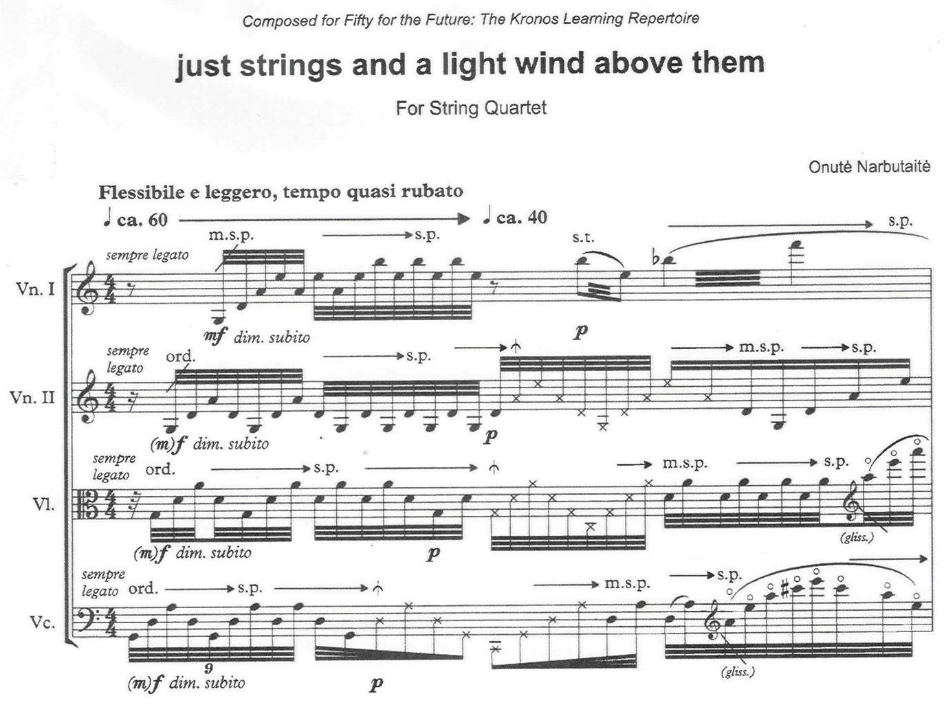 3 pav. O. Narbutaitė. „Just strings and light wind above them“ styginių kvartetui, 2017. Virsmų ir įtampos „grynų“ intonacijų sąveika
