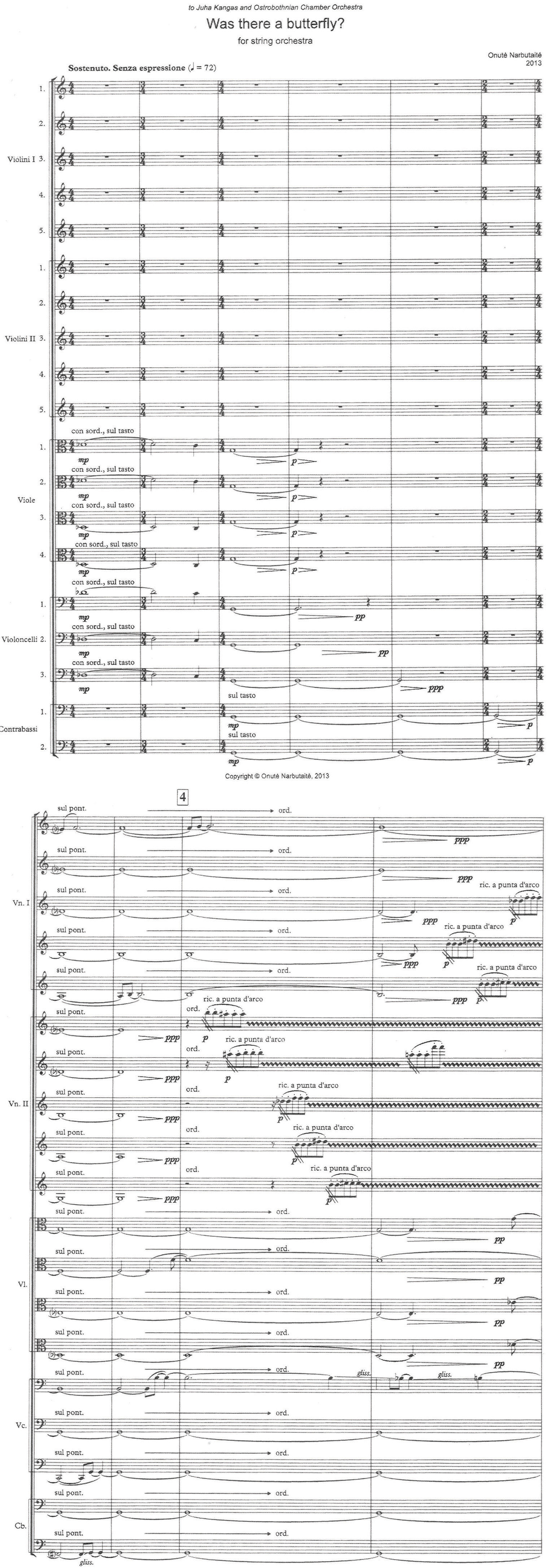 Šių procesų pradžia yra kūrinyje, kuris tarsi nušvietė kelią O. Narbutaitės egzistencinės literatūros stygos įtampai, „būties trapumo“ garso įvisuotinimo koncepcijai. Tai Ostrobotnijos orkestro, diriguojamo Juha Kangaso (atlikusio ir ankstesnius autorės kūrinius), inicijuotas simfoninis opusas „Was there a butterfly“? („Ar buvo čia drugelis?“, 2013). Kompozitorė taip nusako kūrinio idėją: drugelis yra iš graikų antikinės mitologijos atėjęs žodis, reiškiantis Psichę – žmogaus dvasią. Šio įvardijimo kontekstas dar kartą paliudija O. Narbutaitės kūryboje esančią literatūrinės dominantės lemtingą visa jungiančią Savasties ir Šešėlio sankirtą. Garso ribinės situacijos „įvaizdinime“ sudalyvauja lingvistinis gestas – klaustuko leitmotyvas: „Ar buvo čia drugelis?“, ir klausimas tampa tarsi dar vienas veiksmas kūrinio gimime... prieš prasidedant tikrajam muzikiniam judėjimui – iš gelmių kylančiam ostinato. O. Narbutaitės dėmesys muzikos atsiradimo kontekstui yra itin iškilus, išties daug reiškiantis verbalinis gestas, netgi reiškinių sąveikos „dirigentas“ ir inspiratorius. Kontekstas tarsi dienoraštis, visada išliekantis ištikimas sau, žvelgiantis per asmeninę patirties ir atminties prizmę, taip išpildantis egzistencialistinį menininko ir pasaulio, užkoduoto transcendentiniais šifrais, paveikslą.