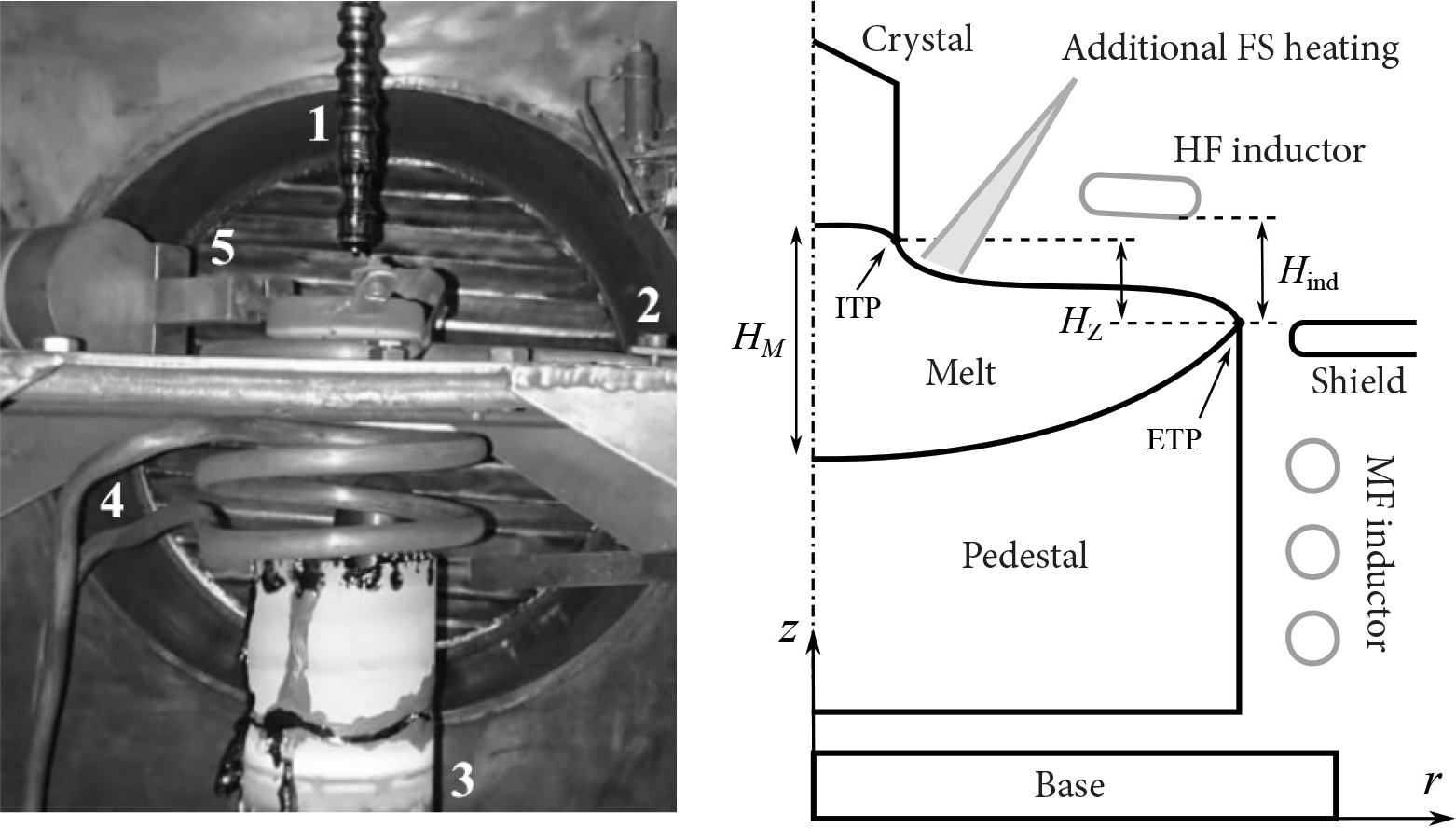 PM has a limitation on an inductor shape in comparison with FZ that prohibits ‘needle-eye’ inductors: the diameter of the grown crystal cannot exceed the inner diameter of the inductor. It happens because in the cylindrical stage of crystal growth (when the shapes of the molten zone and the grown crystal diameter do not change) 11° meniscus angle (the angle between the free melt surface and the crystal side surface) is required [3], and the diameter of the molten zone cannot be smaller than the crystal diameter. Due to a large inductor diameter, freezing of the molten zone in the centre becomes more likely when the crystal diameter increases, and an additional medium-frequency (MF) inductor needs to be used for pedestal heating (see Fig. 1, left).