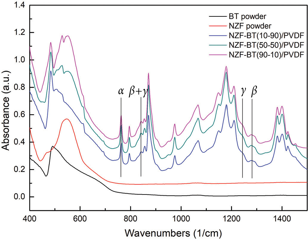 The broad band at around 503 and 546 cm–1, the intensity of which increases by increasing the filler amount, is due to the BT and NZF powders, respectively, and it is connected to the metal–oxygen (M-O) stretching vibrations. In all the composites the peaks characteristic of the two electroactive phases (i.e. β and γ) are identifiable but with a different intensity depending on the film composition. Using Eq. (1) the amounts of α (Fα) and electroactive phases, β (Fβ) and γ (Fγ), were derived. The amount of electrically inactive α phase is dominant and the electroactive phases in all flexible films NZF-BT/PVDF/possessed 37–40% of the most desirable ferroelectric β phase with traces of the γ phase [8, 9, 24–27]. This percentage slightly increased with the amount of NZF in the film. For the comparison, flexible films prepared from pure BT and NZF powders have shown the formation of the same amount of the electroactive β phase, ~38%.